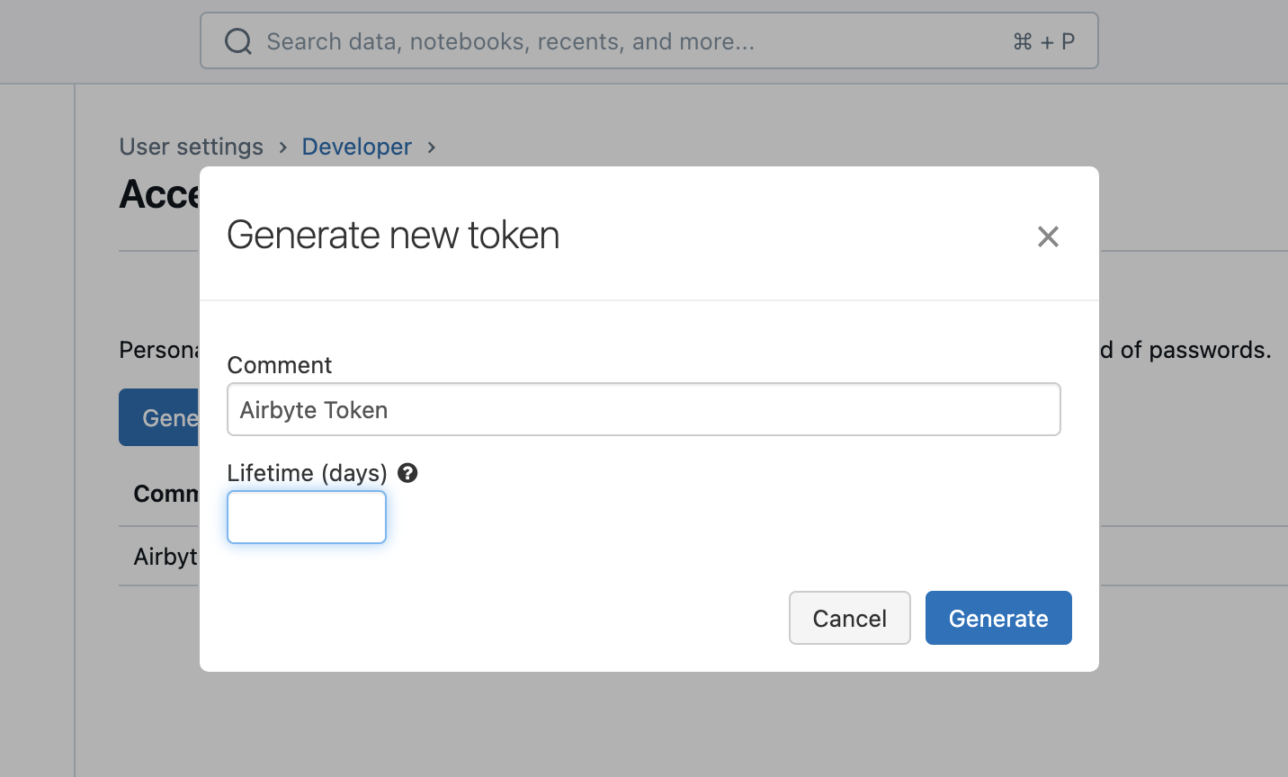 3. Enter a description for the token and how long it will be valid for (or leave blank for a permanent token):
